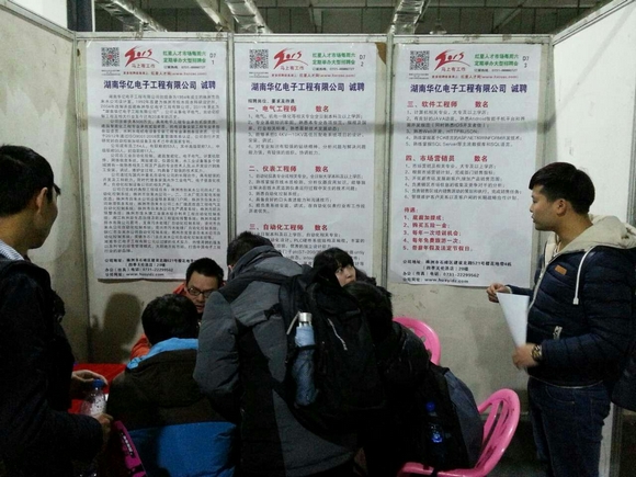 2015年3月12日湖南華億電子工程有限公司副經理陳鋼等參加長沙市紅星人才市場大型招聘會,希望能引進新的人才幫助公司更好的發展,同時也提供了一個良好的平臺讓精英們向社會展示自己的工作能力。本次需要招聘軟件工程師和市場營銷人員,已有10人愿意來公司工作。